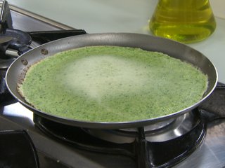 3. Una vez pasado el tiempo de reposo colocar en una sartén pequeña un cubo de manteca y un cucharón de la pasta de crepes de espinaca. Cocinar de ambos lados.