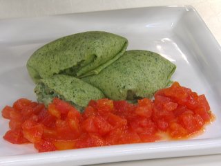 8. Retirar las crepes del horno. Servir en un plato y salsear con el tomate fresco salteado.
