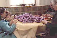 Las rosas se depositan en el centro de una mesa, alrededor de la que puede que incluso coincidan tres generaciones de mujeres de la misma familia, que esbrinan (separan los estigmas de la flor) todos los días que dura la recolección, desde finales del mes de octubre. Las esbrinadoras cobran su sueldo en especie (la cuarta parte del trabajo realizado), que controla la dueña de la casa, quien pesa el azafrán trabajado en una balanza de cruz y anota, día a día, las cantidades acumuladas por cada uno de los participantes en la mesa.