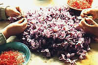 »Cada tableta que ves ahí encima es equivalente a un lingote de oro de casi el mismo peso», comentaba el contable italiano Maistro Doro a Marco Polo, poco antes de su partida hacia la legendaria Caray, cuya república se convirtió en el mercado azafranero más influyente del Mediterráneo durante los siglos bajomedievales. Estas recomendaciones son del todo ciertas cuando se afirma que el valor en peso del azafrán supera al del oro; su uso está asociado a una gastronomía de alta calidad y a la tradición textil más exquisita de Oriente Medio, donde se emplea para teñir túnicas y el cabello. Son necesarias más de 250,000 flores para obtener un kilogramo, que nacen al ras del suelo, son recogidas de forma manual y cuyos estigmas se separan también a mano, una tarea casi exclusiva de mujeres.