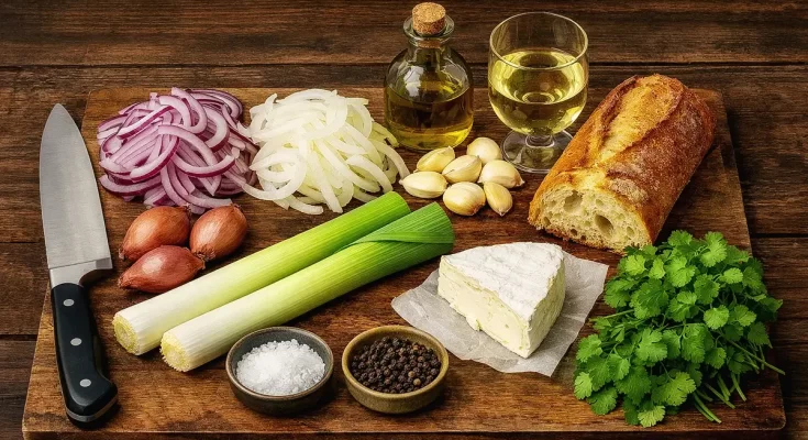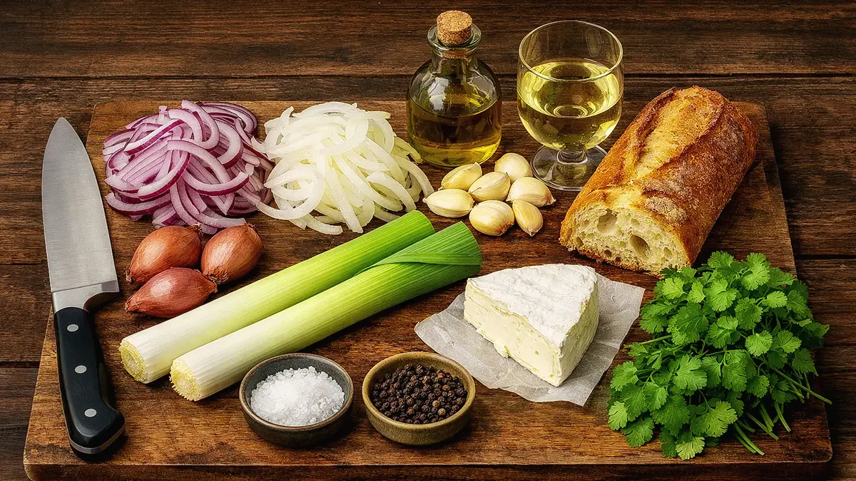 Esta sopa de cebollas se «revuelca» en la receta original francesa, pero con resultados completamente diferentes. Incluye a los otros miembros de la familia de las cebollas, como los puerros, las chalotas y el ajo. Se puede servir con la tradicional lonja de pan frito, o, si prefieres, adornada con crustones y queso parmesano.